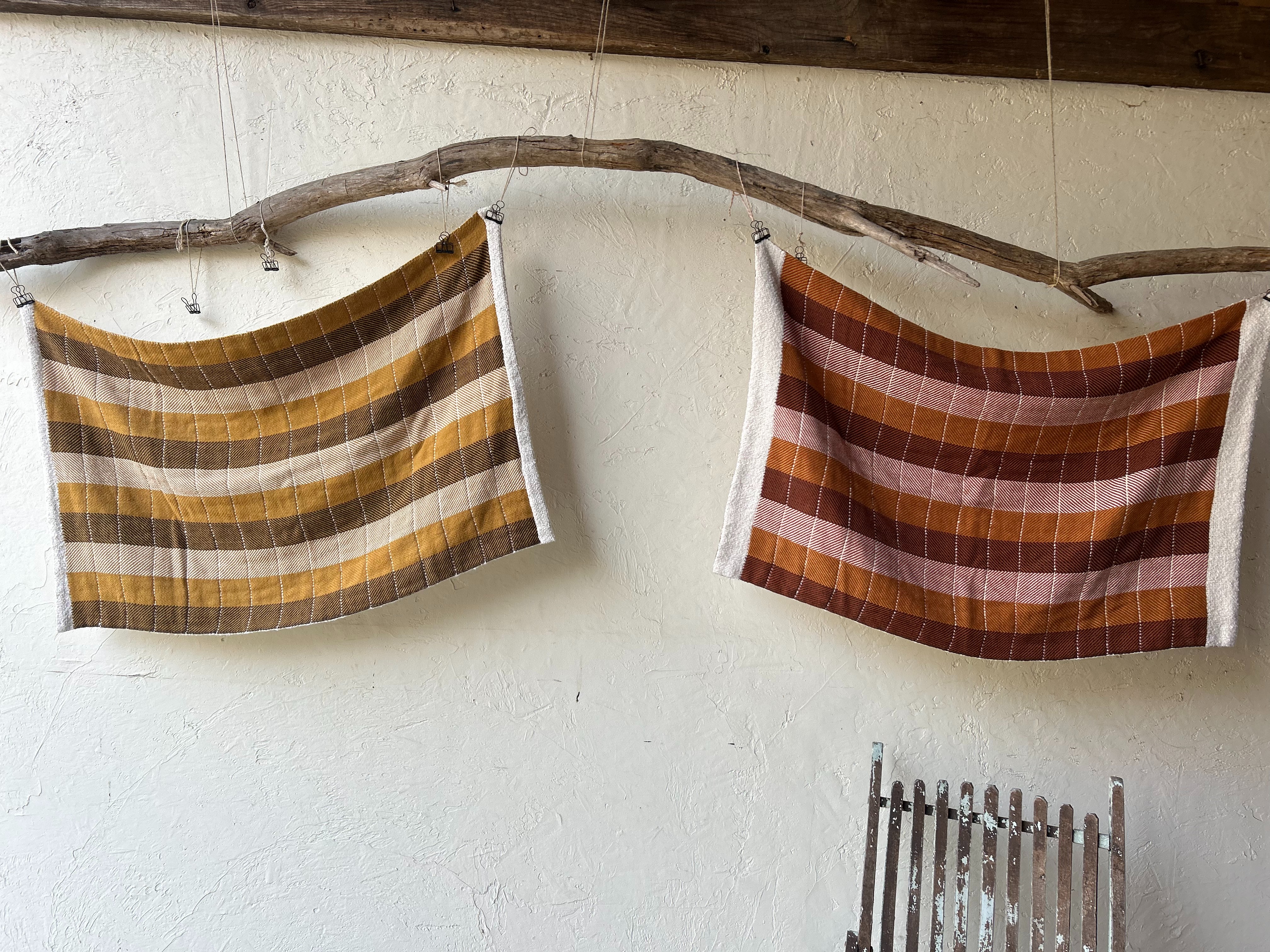 I started with a 1:3 ratio of thick to thin. 8 for Monte Cristo and & 24 for the cottolin with the thin threaded in a 3/3 twill and the thick threaded to plain weave. That was my “duh!” moment when I realized that the thick threading was the determiner of the stitching pattern on the thin side. I then moved to a 1:2 ratio, 9 for thick and 18 for thin with thick threaded to twill and thin threaded to plain weave. I liked this texture, but realized that most weavers don’t have 9-dent reeds. So for my final version and after working with Jane Stafford and her alarmingly open setts, I moved to 1:2 ratio of 8 for thick and 16 for thin with thin threaded to plain weave and thick threaded to a point twill. I know this sounds riskily loose, but the stitching takes up space and I wanted a super cuddly result.