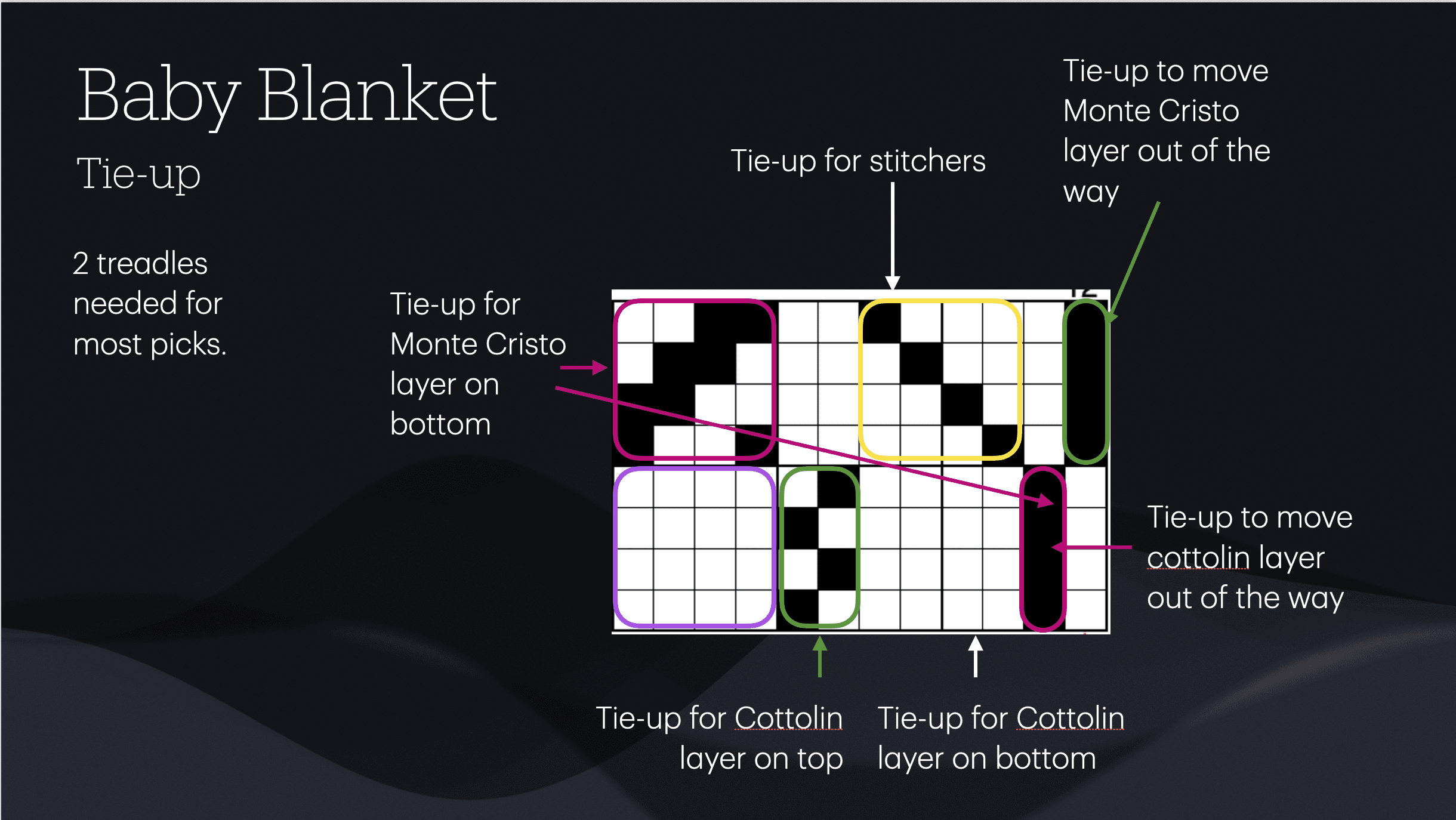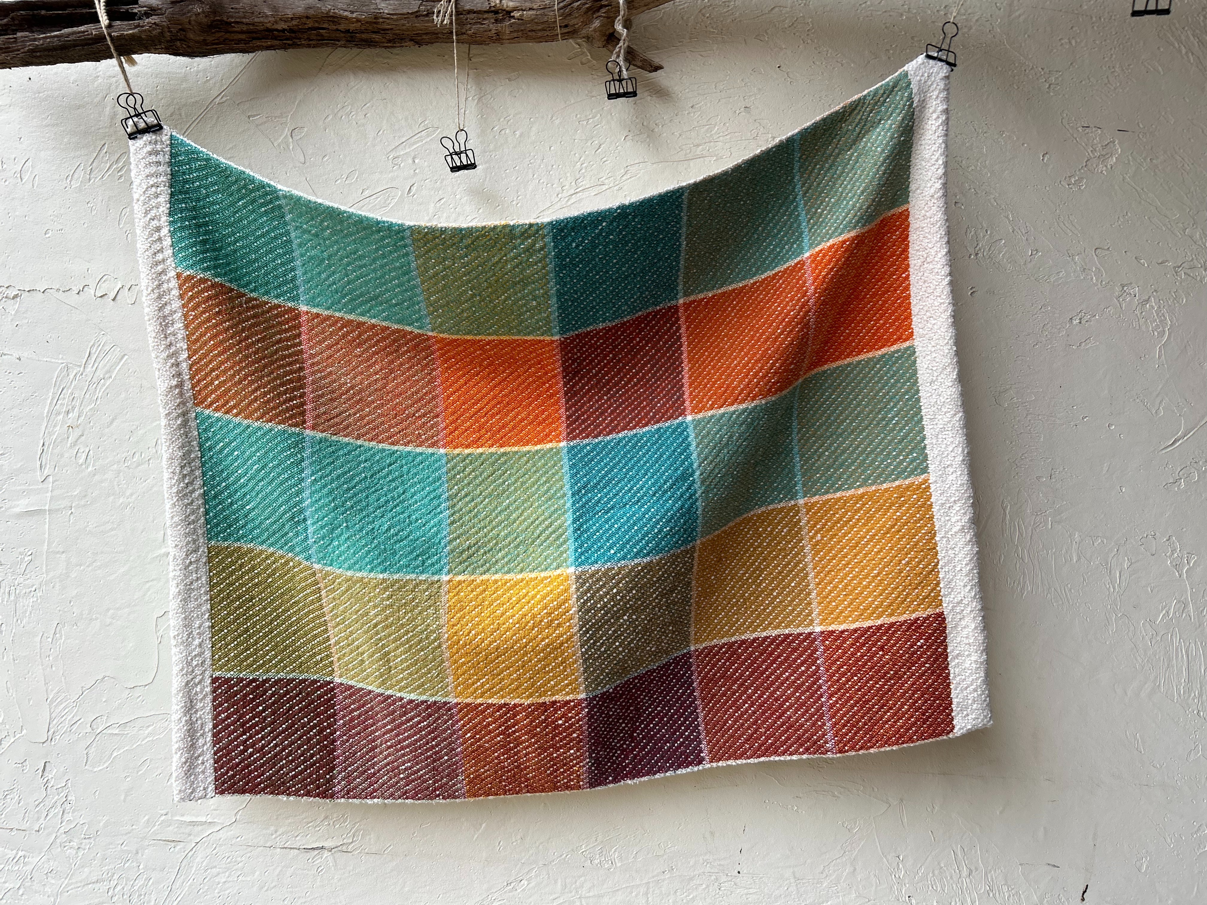 I had always wanted to figure out a way to get a baby blanket that was as soft as a knitted blanket. My mind kept going to super soft yarns like merino and baby alpaca, but I knew that new parents would not thank me for a luxury blanket that they couldn’t wash. And I did have a couple cones of Henry’s Attic Monte Cristo boucle cotton on my shelf (material). I really wanted to use the Monte Cristo because it is so soft, and affordable. The down side was that it is only available in Natural. So, in order to get a colorful and soft baby blanket, I decided that I would use some variation of double weave.