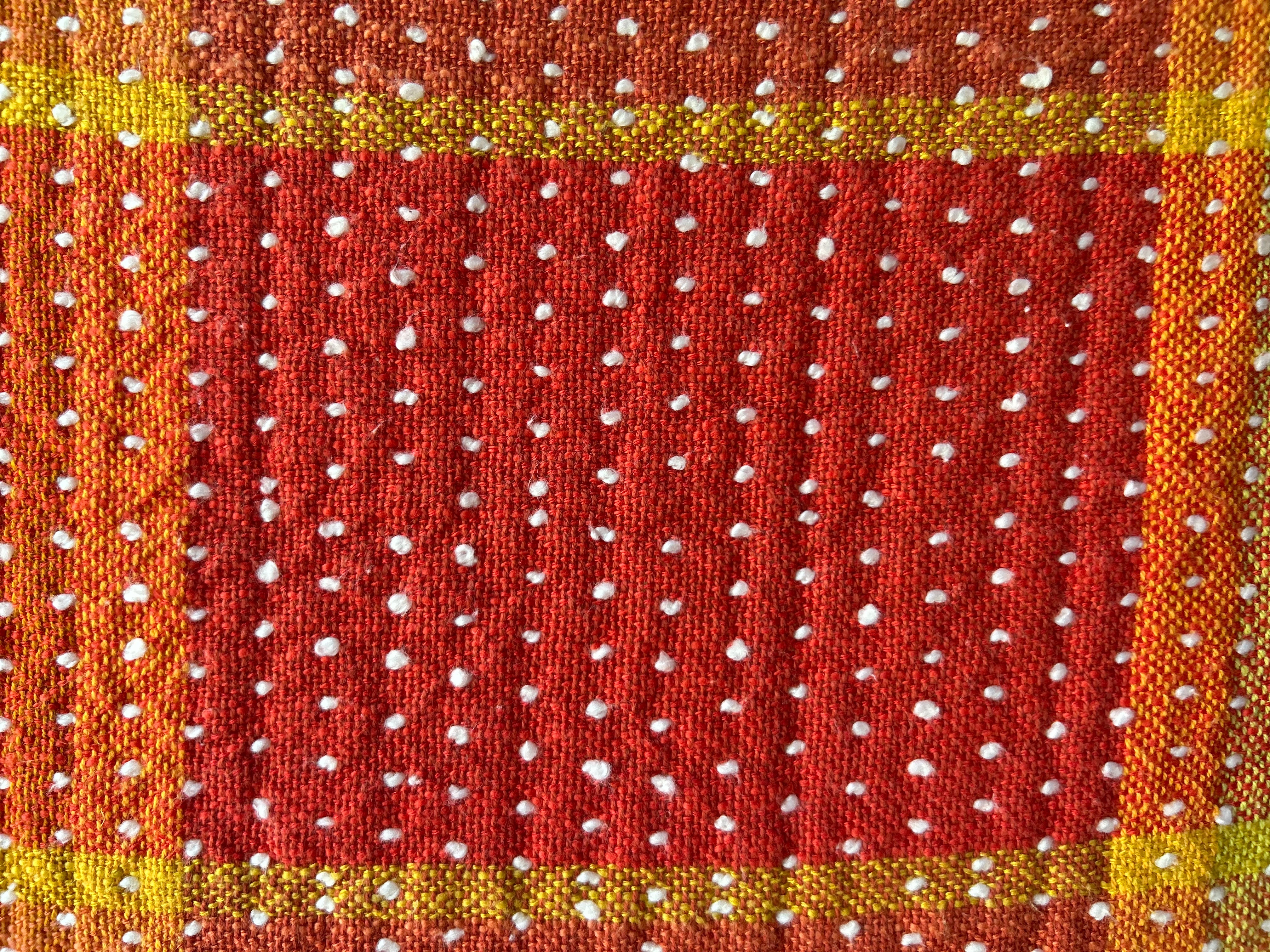 For the final warp, I wove a version in which I placed the stitchers every 8th & 9th pick which I think was a perfect interval, but that was a real “pat your head/rub your stomach” treadling sequence in which the stitchers didn’t fall at the same place in the thick treadling sequence,