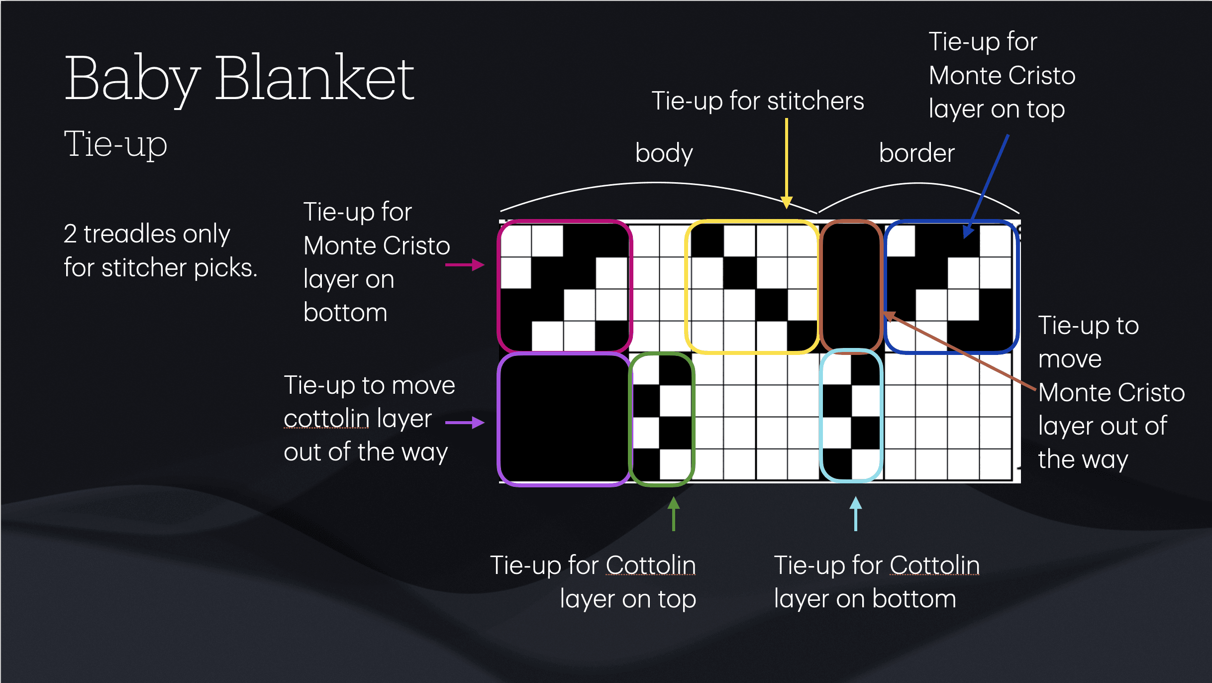 I have woven a lot of double weave, but didn’t want the firmness that comes with a lot of block double weaves. I loved the texture of the few things that I had woven in stitched double cloth, and knew that for a baby blanket, I didn’t want to stuff the layers (often called matelassé) or have a one-sided blanket (true of a lot of piqué). So I went the stitched double cloth route, and started drafting with the help of my friends:
