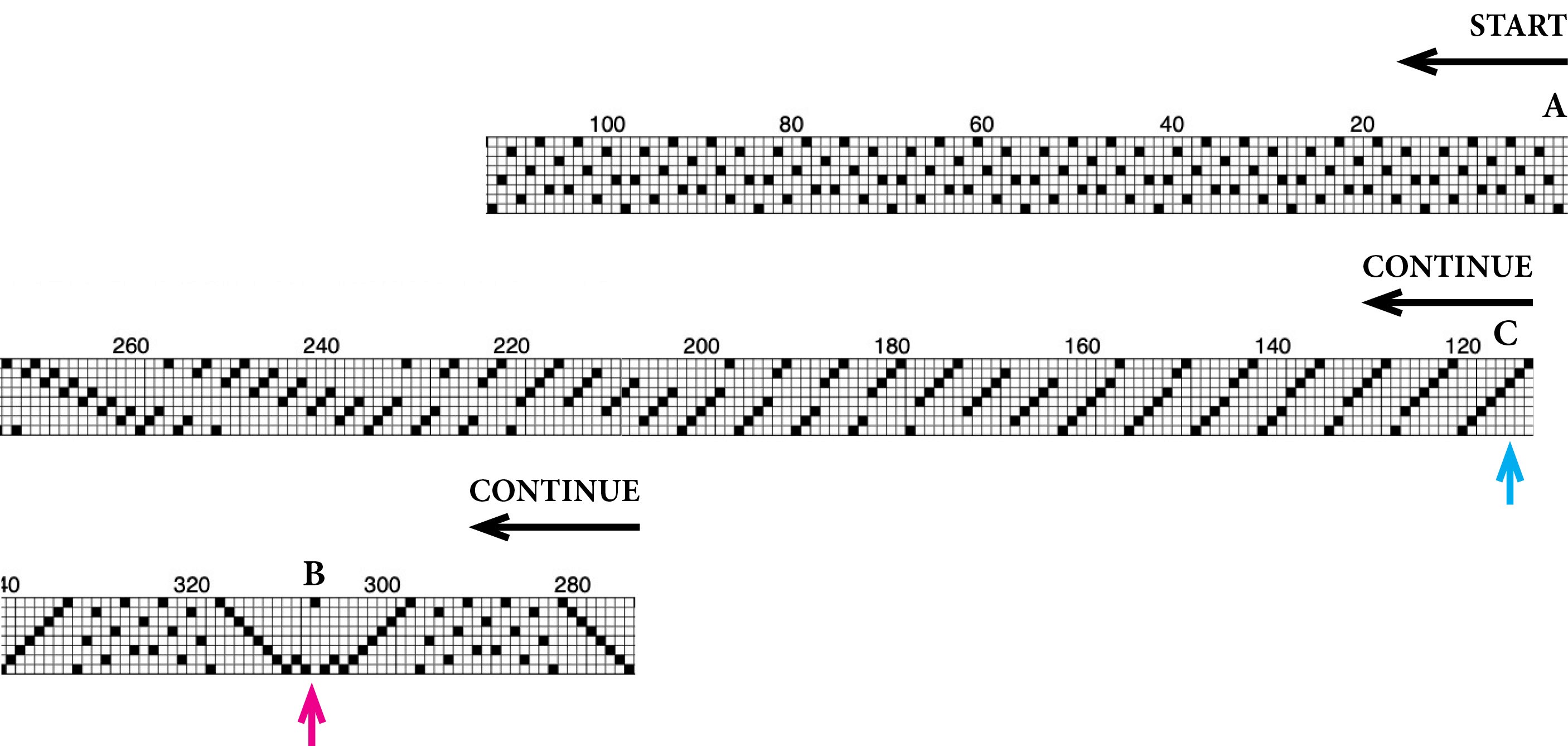 Here is about a quarter of the threading of the star twill. The pink arrow (at B) indicates the middle of one star, and the blue arrow (at C) indicates the middle of the threading. The full threading can be read as follows: thread A to B, then B to C, then C to B, then B to A, for a total of 998 ends.