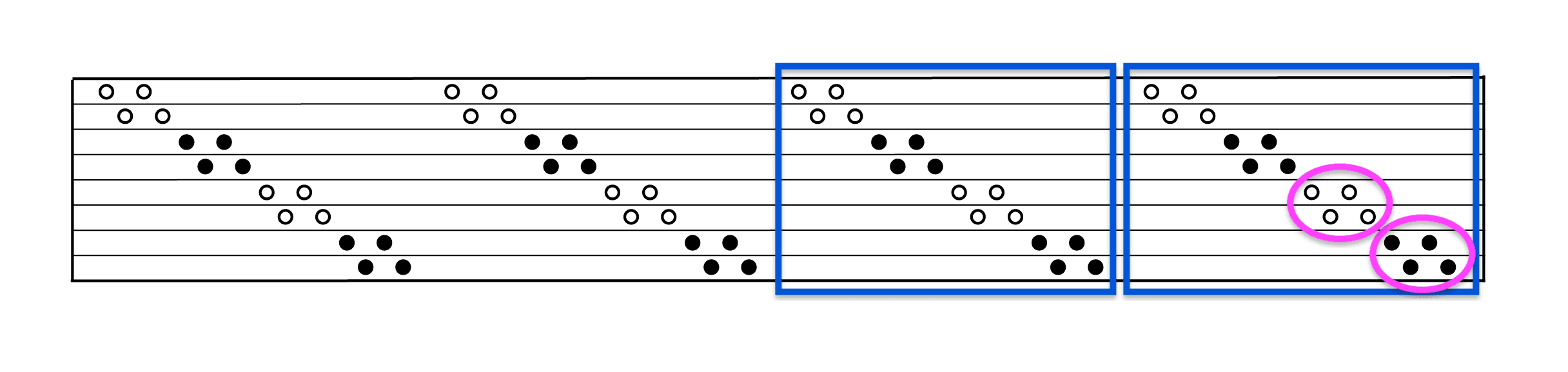 This threading has two levels of repeats: the 4 thread groups (pink ovals), and the groups of groups (blue rectangles). It can be easy to get lost in the threads. When reaching the end of a blue rectangle repeat, it is a good idea to step back and check that groups of black and white threads alternate regularly, and that they are threaded on the correct shafts.