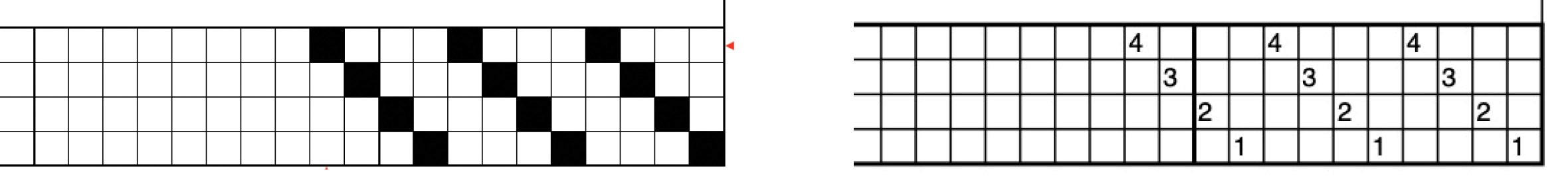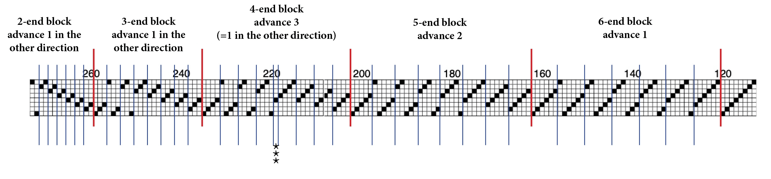 The advancing twill segment. It starts with one full straight draw—easy peasy—, then moves to a 6-end block advancing twill, then to a 5-end advancing twill, all the way to a 2-end advancing twill. The thin lines show the repeats within each advancing twill. The three stars in the middle of the 4-end advancing twill indicate an extra end between two repeats.