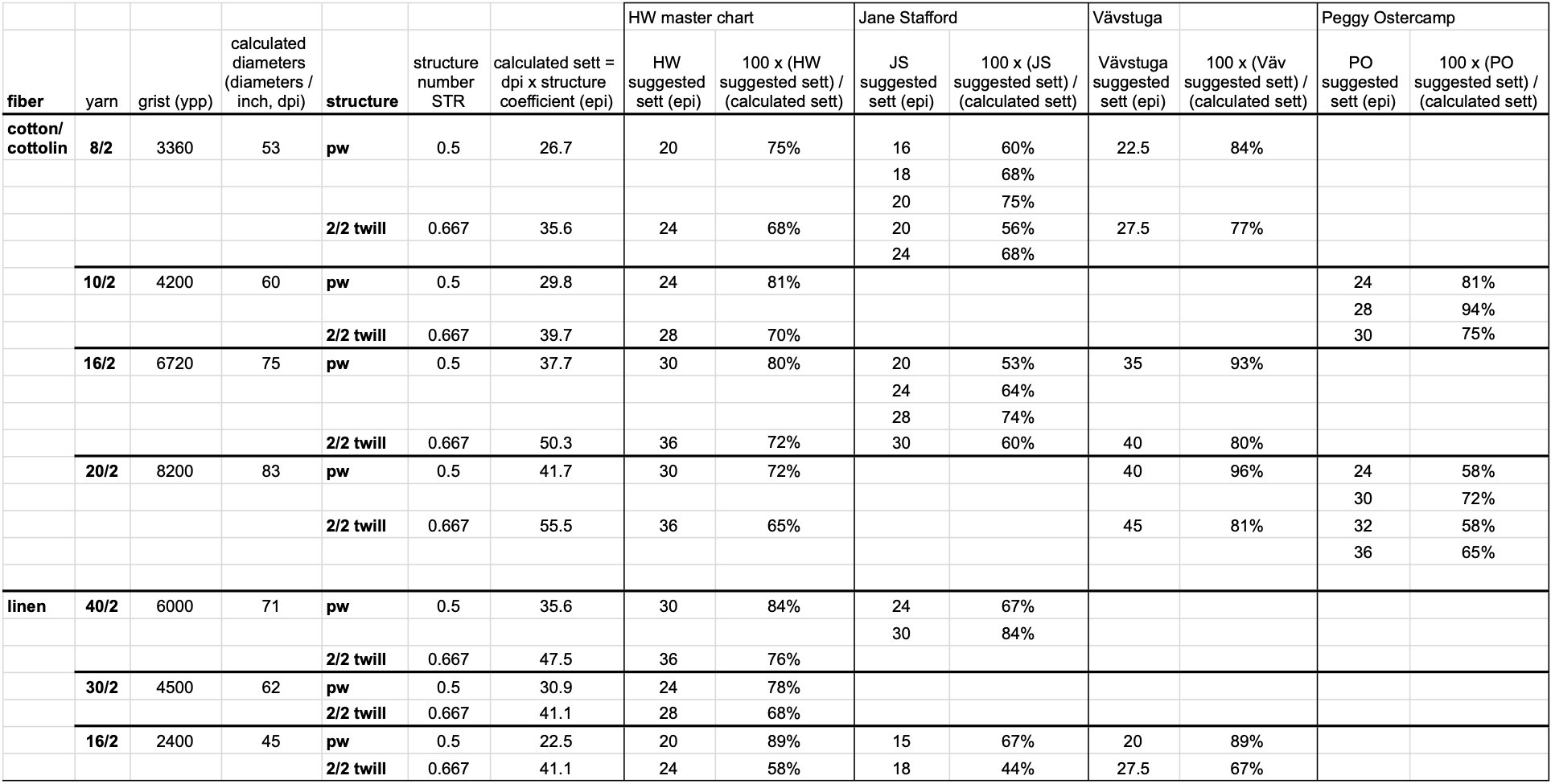We compiled suggested setts for cotton and linen yarns from the Handwoven Master Chart, Jane Stafford School of Weaving, Vävstuge Weaving School, and Peggy Ostercamp. Unfortunately, the only sctuctures for which recommended setts are widely available are plain weave and (2/2) twill.