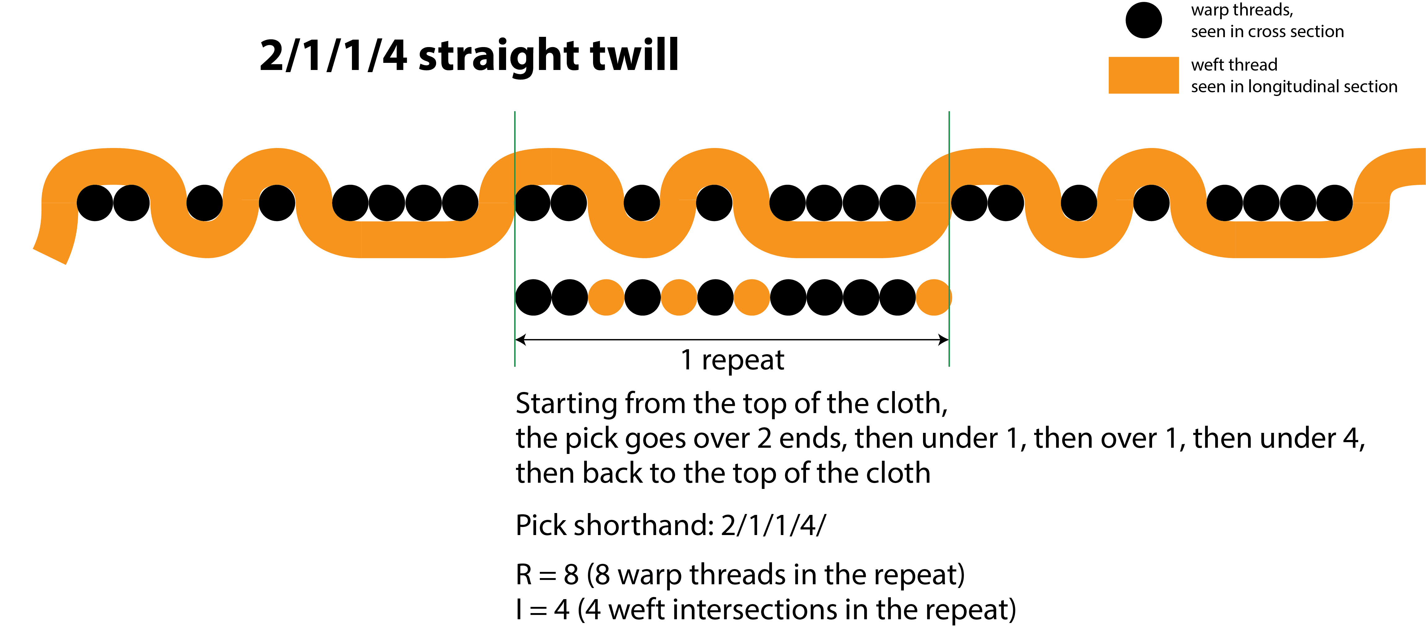 For a straight twill such as the one represented below, a 2/1/1/4 twill, the pick shorthand is the usual name of the twill with an extra / added at the end: 2/1/1/4/.