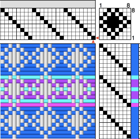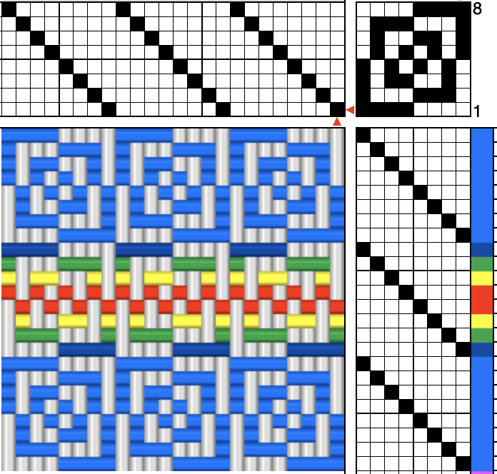 One Pinwheel repeat boils down to 2 picks each of 4/4/, 3/1/1/3/, 2/1/1/1/1/2/ and plain weave.
